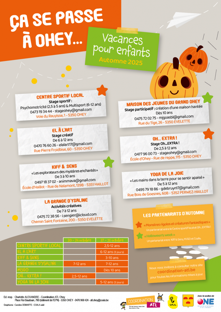 Du 27 au 31 octobre 2025 | 2.5 à 12 ans | Stage sportif -psychomotricité (2,5 à 5 ans) / multisports (6 à 12 ans) | Centre Sportif Local | Hall omnisport d'Ohey - Voie Rauyisse, 1 - 5350 OHEY | stageohey@gmail.com - 0473/19 34 44 |
