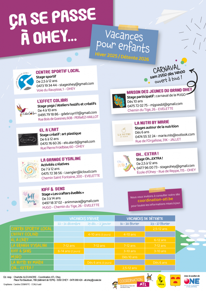 | Du 23 au 27 février 2026 | de 2.5 à 12 ans | Semaine récréative et sportive | Centre Sportif Local | Voie du Rauyisse 5350 OHEY | stageohey@gmail.com |