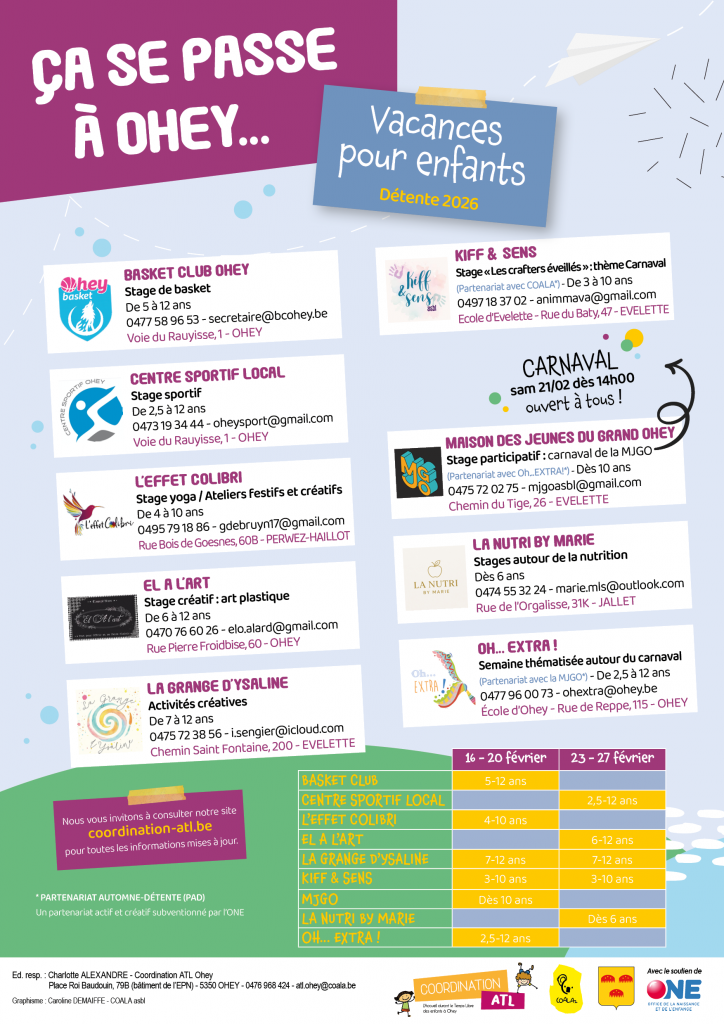 | Du 23 au 27 février 2026 | de 3 à 10 ans | Stage des crafters éveillés : 'Enquête autour d'un carnaval mystérieux" (Partenariat avec l'asbl Coala) | KIFF&SENS asbl | Ecole d'Evelette - Rue du Baty 47, 5350 Ohey | animmava@gmail.com - 0497/18 37 02 0472/49 24 65 |